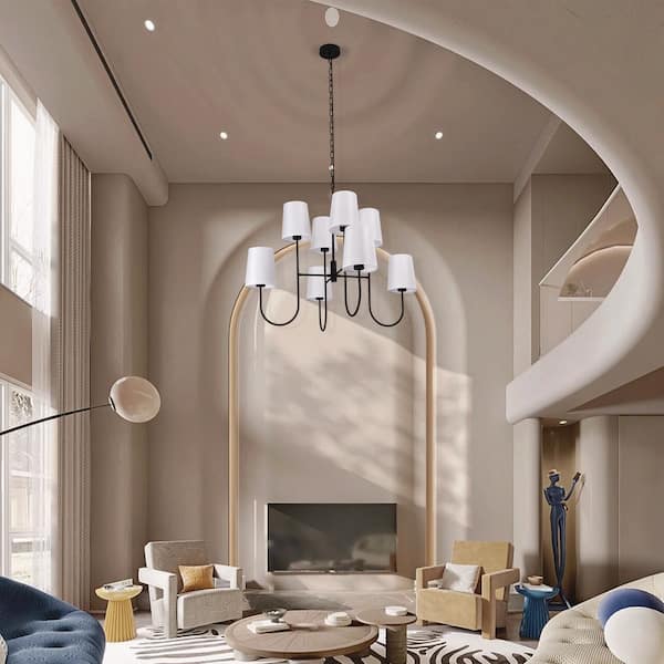 8-Light Matte Black Sputnik Chandelier with White Fabric Shade for Living Room Bedroom