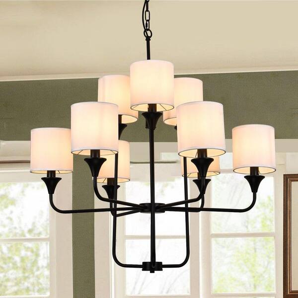 9-Light Matte Black Traditional Branch Chandelier with White Fabric Shade for Kitchen Island