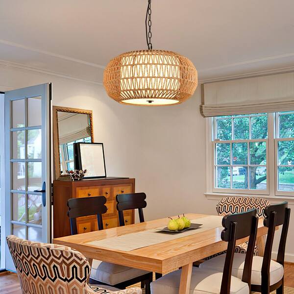 Farmhouse 3-Light Black Chandelier with Yellow Cage Woven Rattan and White Drum Fabric Shade