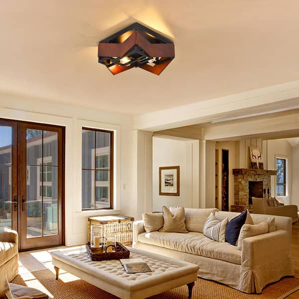 Farmhouse Rustic 16.6 in. 2-Light Black Square Metal Flush Mount with Wooden Shade