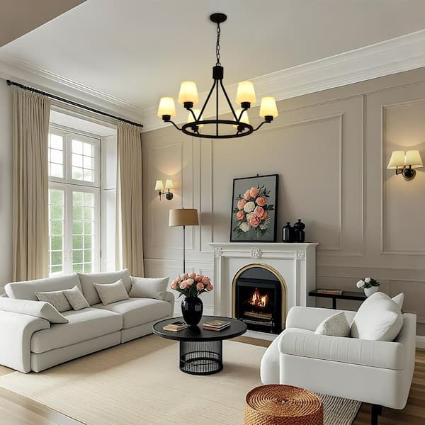 Industrial 6 Light Black Wagon Wheel Island Chandelier with White Opal Glass Shade for Kitchen Island Dining Living Room