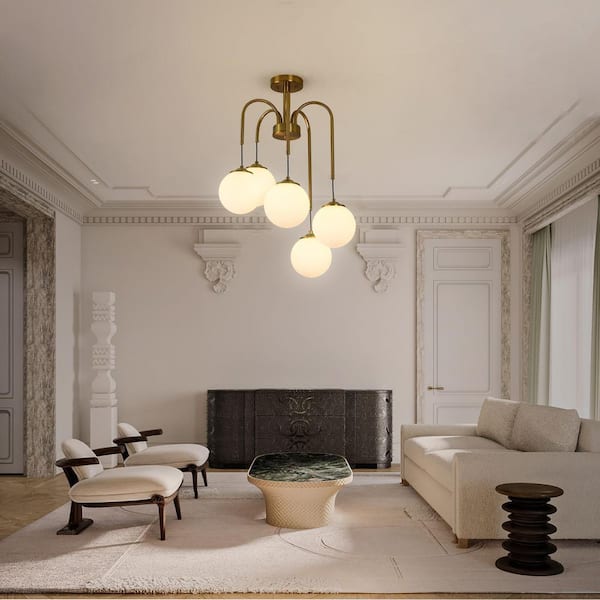 Modern 17.76 in. 5-Light Brass Sputnik Semi-Flush Mount Dimmable Branch Chandelier with Vintage Globe Milk Glass Shade