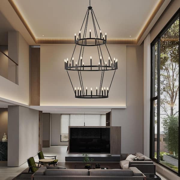 Modern 36-Light Black 3-Tier Wagon Wheel Farmhouse Industrial Chandelier Rustic Candlestick Pendant Light