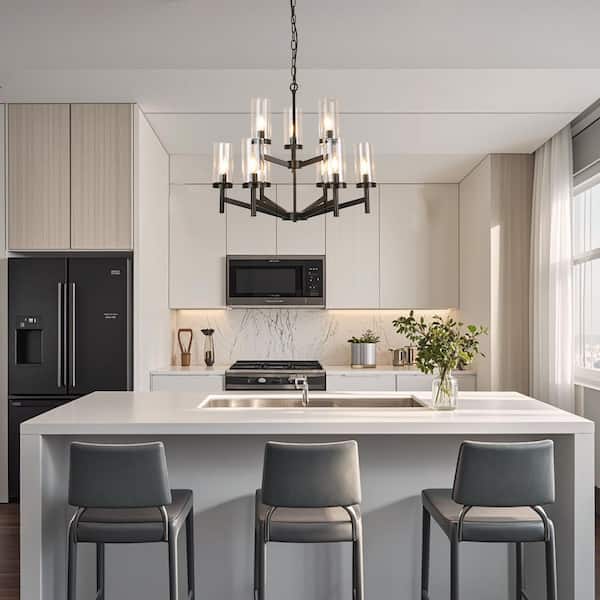 Modern 9-Light Matte Black Branch Chandelier with Clear Glass Shade for Kitchen Island