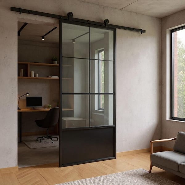 36 in. x 84 in. 6 Lite Frosted Glass Black Steel Sliding Barn Door with Hardware Kit