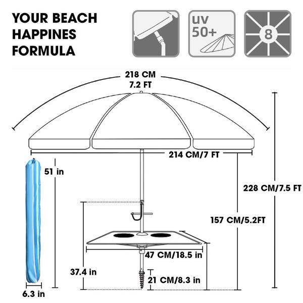 7 ft. Metal Tilt Beach Umbrella with Sand Anchor and Carry Bag, Built-in Table Tray in Baby Blue Stripes
