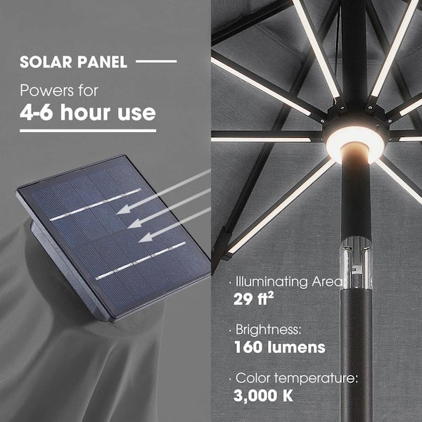 9 ft. Aluminum Outdoor Solar Patio Umbrella LED Table Umbrellas with 16 LED Strip Lights and Hub Light in Dark Gray
