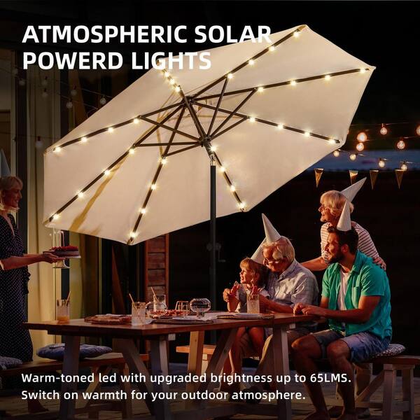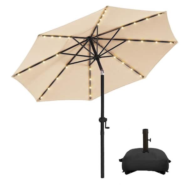 9 ft. Aluminum Solar Led Market Umbrella Outdoor Patio Umbrella with Base and 32 LED Lights in Beige