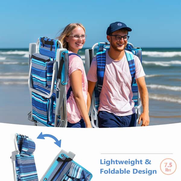 Striped Blue Aluminum Folding Adjustable Headrest Medium Beach Chair with (1-Pack)