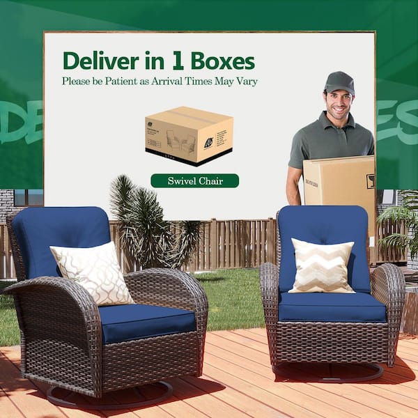 2-piece Brown Wicker 360° Swivel Outdoor Rocking Chair with Navy Blue Cushion