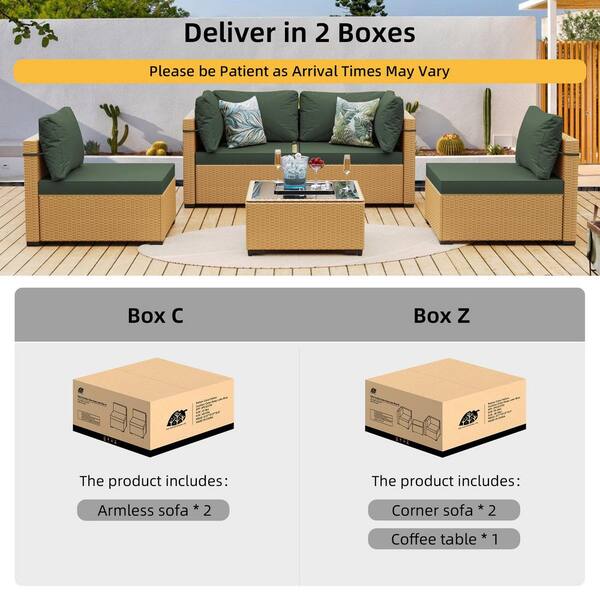 5-Piece Beige Wicker Patio Conversation Set with Pine Green Cushions and Coffee Table