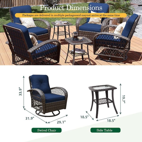 6-Piece Brown Metal Wicker 360° Patio Conversation Outdoor Rocking Chair Set with Navyblue Cushions