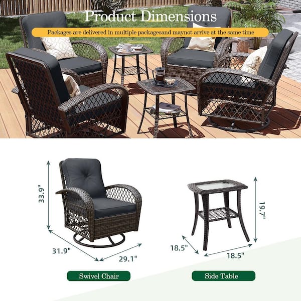 6-Piece Brown Wicker 360° Patio Conversation Outdoor Rocking Chair Set with Dark Gray Cushions