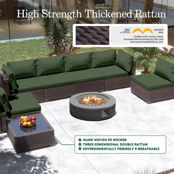 8-Piece Rattan Patio Conversation Set with Cushions and 42 in. Outdoor Round Fire Pit Table, Pine Green Cushions