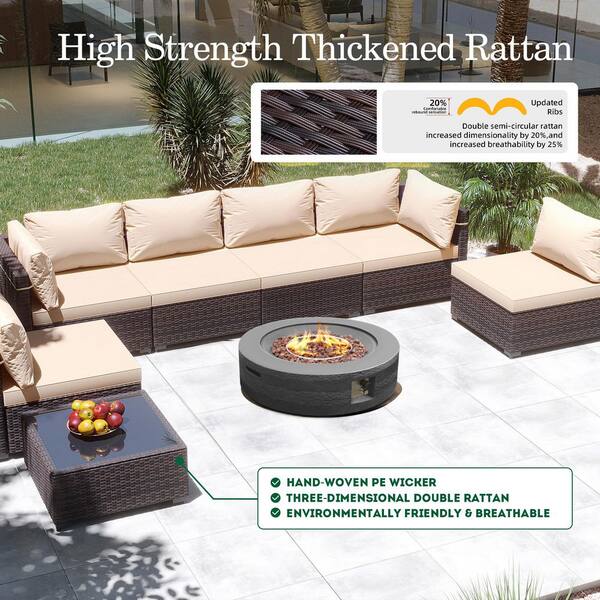 8-Piece Wicker Patio Conversation Set with Cushions and 42 in. Outdoor Round Fire Pit Table, Beign Cushions