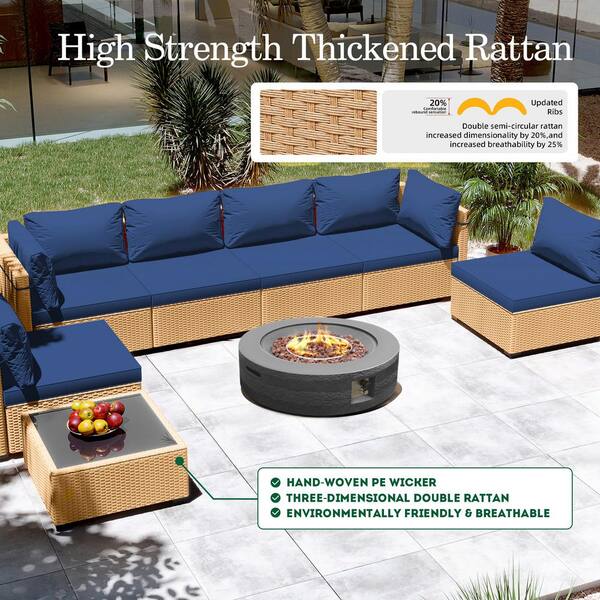 8-Piece Wicker Patio Conversation Set with Cushions and 42 in. Outdoor Round Fire Pit Table, Navy Blue Cushions