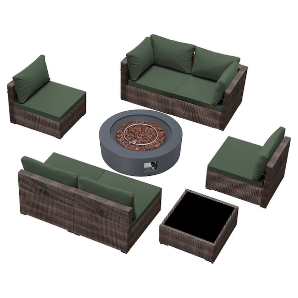 8-Piece Wicker Patio Conversation Set with Cushions and 42 in. Outdoor Round Fire Pit Table, Pine Green Cushions