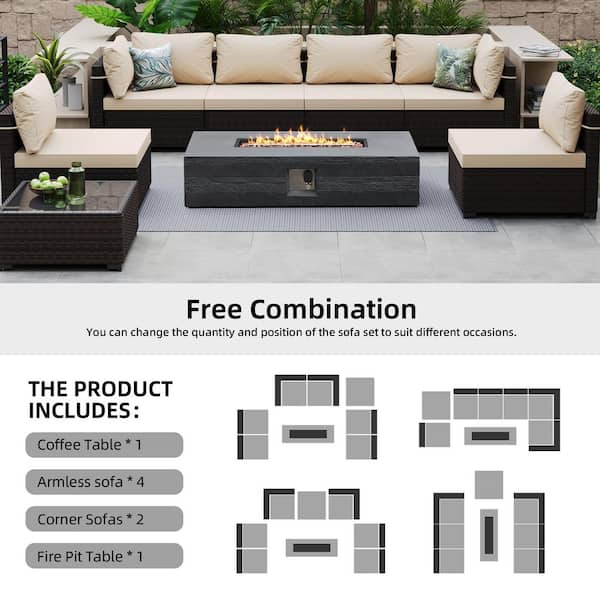 8-Piece Wicker Patio Conversation Set with Cushions and 56 in. Outdoor Rectangle Fire Pit Table, Beige Cushions