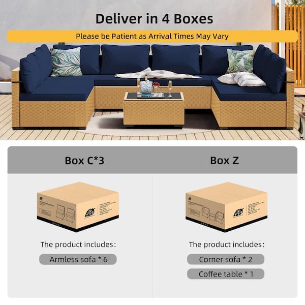 9-Piece Beige Wicker Patio Conversation Set with Navy Blue Cushions and Coffee Table