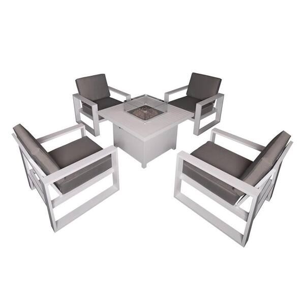 5-Piece Aluminum Patio Conversation Set with White 41.34 in. Fire Pit Table, Gray Cushion - 4 Armchair