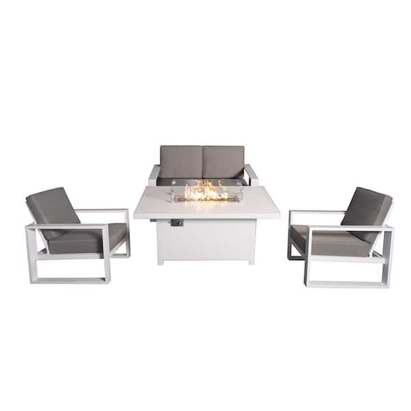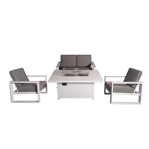 Aluminum Patio Conversation Set with Gray Cushion, White 55.12 in. Fire Pit Table Sofa Set - 2 Armchair+Loveseat