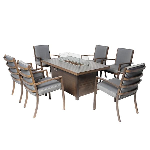 Patio Dining Set, 7-Piece Aluminum Outdoor Dining Set with Gray Cushion and Fire Pit Table - 6 Armchair