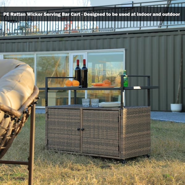 PE Rattan Wicker Outdoor Bar Cart Mobile Serving Cart Trolley Rolling Patio Counter Table with Storage and Wheels, Brown