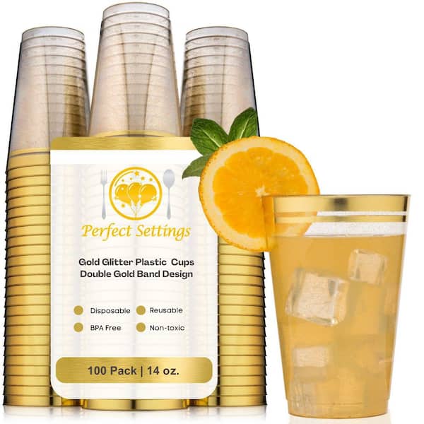 14 oz. 2 Line Gold Rim Gold Glitter Disposable Plastic Cups, Party, Cold Drinks, (100/Pack)