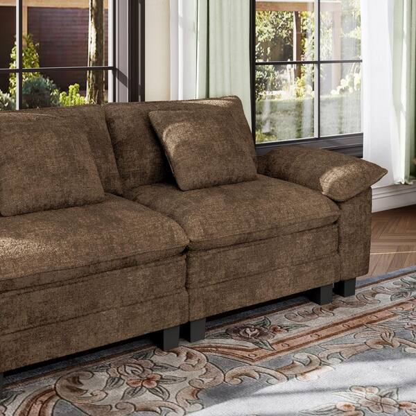 123.6 in. Flared Arm 3-Seat Chenille Modular Sectional Sofa in. Taupe with 3 Throw Pillows for Living Room