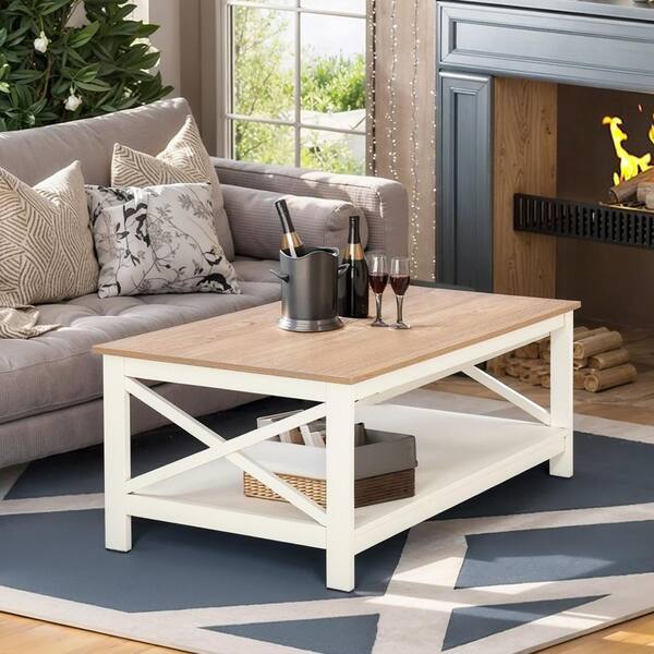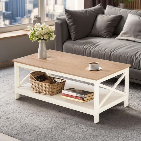 39.3 in. Ivory Rectangle MDF X-Shape Design Coffee Table with Storage Shelf