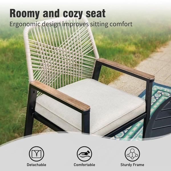 9-Piece Black Metal Patio Outdoor Dining Set with Expandable Rectangle Table and Woven Rope Chair with Beige Cushions