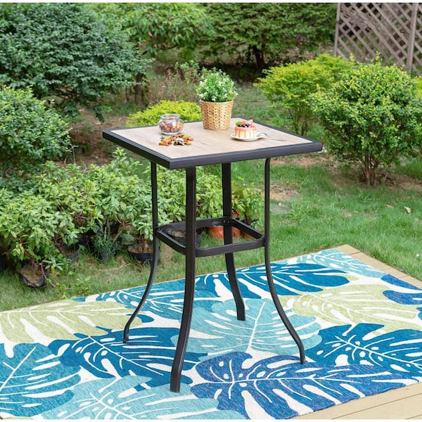 Black 3-Piece Metal Bar Height Outdoor Dining Set with Square Table and Swivel Bar Stools with Beige Cushions