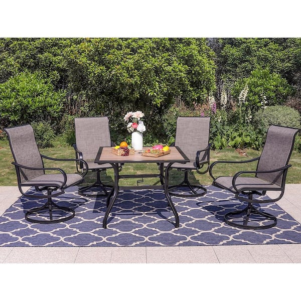 Black 5-Piece Metal Outdoor Patio Dining Set with Wood-Look Square Table and Textilene Swivel Chairs
