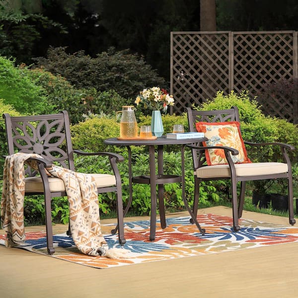 Brown 3-Piece Cast Aluminum Outdoor Dining Set with Round Table and Fixed Chairs with Beige Cushions
