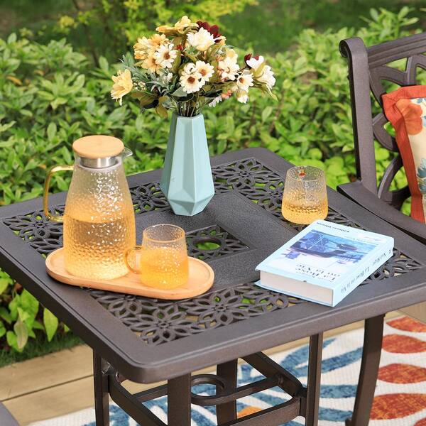 Brown 3-Piece Cast Aluminum Outdoor Dining Set with Square Table and Fixed Chairs with Beige Cushions
