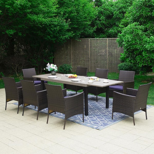 Brown 9-Piece Metal Patio Outdoor Dining Set with Extendable Table and Rattan Chairs with Blue Cushion