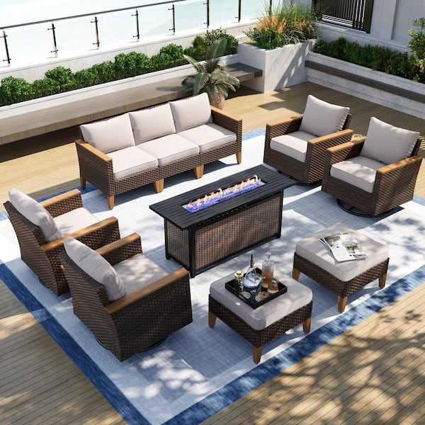 Brown Rattan Wicker 9-Seat 10-Piece Steel Outdoor Fire Pit Patio Set with Beige Cushions, 4 Swivel Sofas and 2 Ottomans