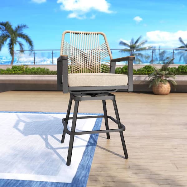 Swivel Metal Patio Woven Rope Outdoor Bar Stools, Bar Height Chairs with Armrests and Beige Cushions (6-Pack)