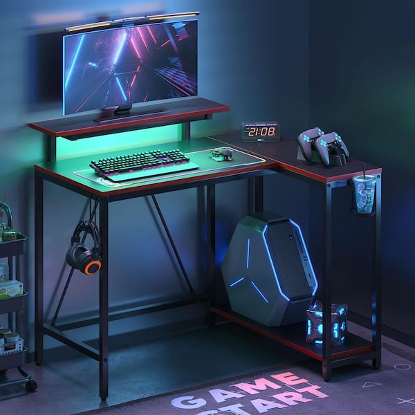 42 in. L-Shaped Black Carbon Fiber Reversible Gaming Desk LED Computer Desk with Storage Monitor Stand and Headset Hooks