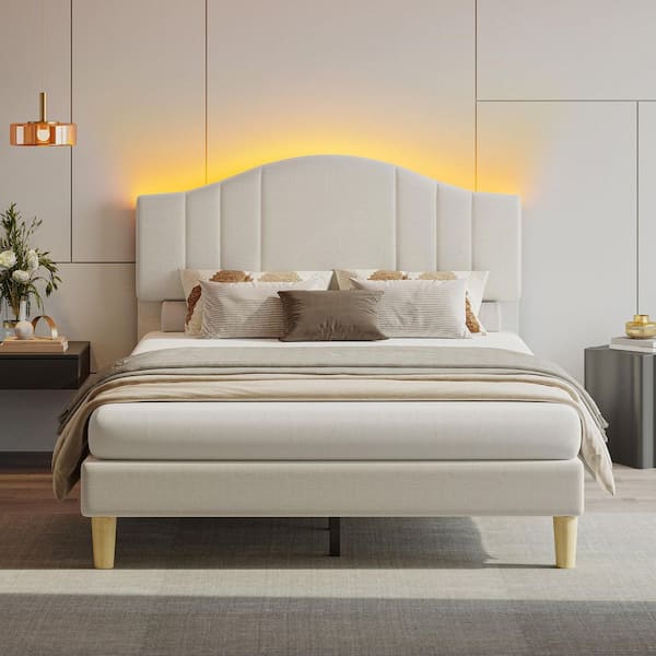 Beige Wood Frame Full Upholstered Platform Bed Scalloped Bed Frame with LED Adjustable Arc Headboard