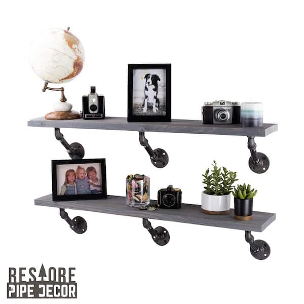 36 in. x 7.5 in. x 6.75 in. Riverstone Grey Restore Wood Decorative Wall Shelf with Industrial Steel Pipe Brackets