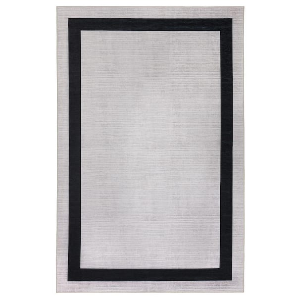 Everest Creme Black 8 ft. x 10 ft. Machine Washable Geometric Modern Border Polyester Non-Slip Backing Area Rug