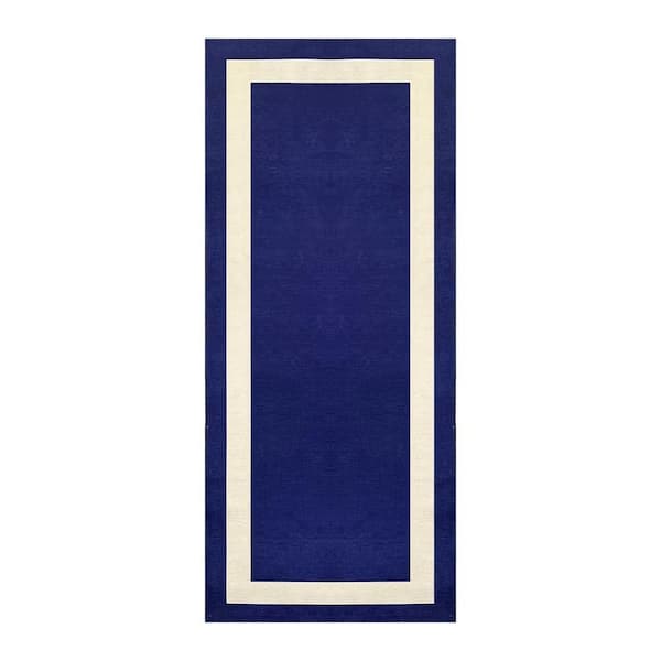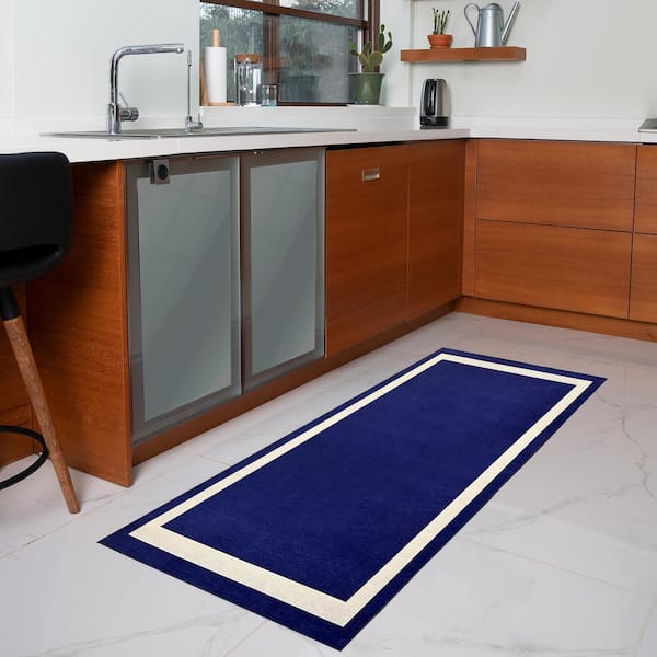 Everest Navy Creme 2 ft. 2 in. x 6 ft. Machine Washable Geometric Modern Border Polyester Non-Slip Backing Area Rug