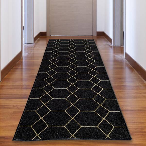 Hexagon Trellis Black Color 26 in. Width x Your Choice Length Custom Size Roll Runner Rug/Stair Runner