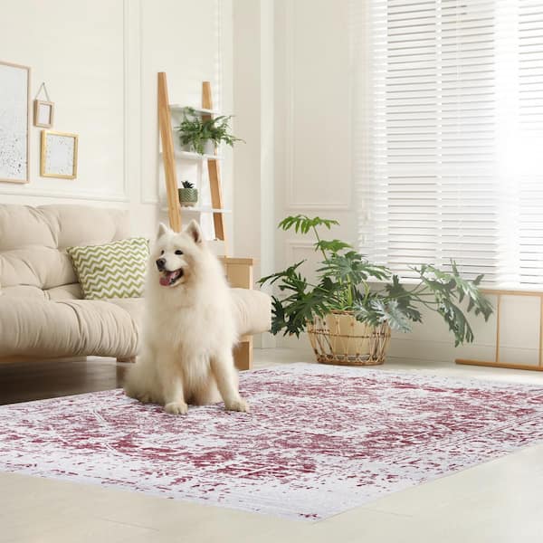 Himalayas Burgundy Creme 8 ft. x 10 ft. Machine Washable Modern Floral Abstract Polyester Non-Slip Backing Area Rug