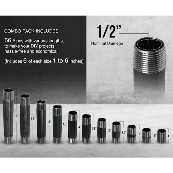 1/2 in. Black Steel Pipe Nipple Assortment, Includes 66 Pipes- 6 of each Length 1 in. - 6 in.