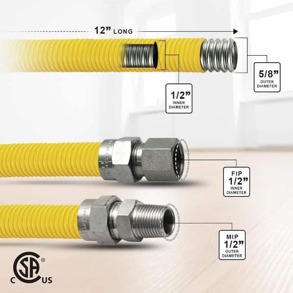 12 in. Flexible Gas Connector Yellow Coated Stainless Steel for Gas Range, Furnace, 1/2 in. Fittings