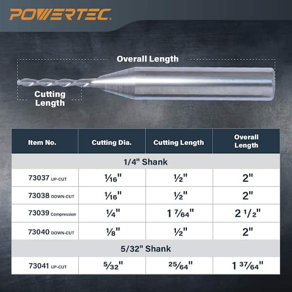• Downcut spiral bit for precise, clean grooves and slots