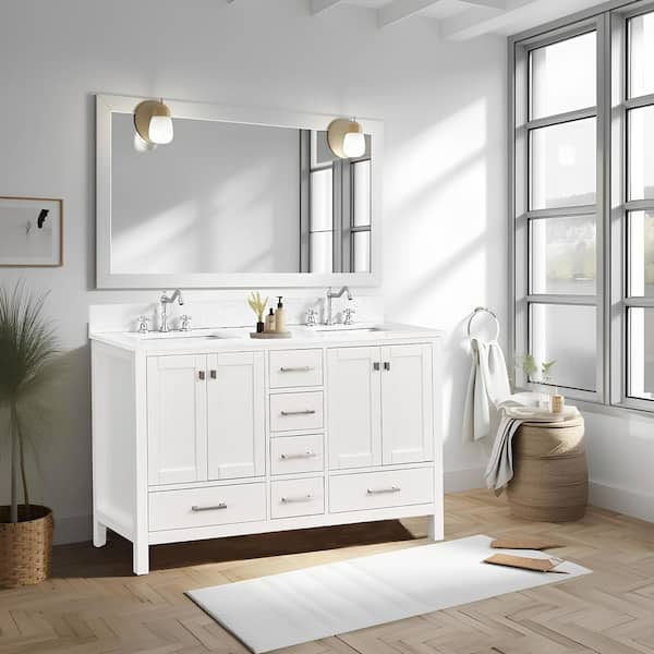 GlamourAura 60 in. W x 22 in. D x 39.24 in. H Double Sink Bath Vanity in White with White Engineered Stone Top