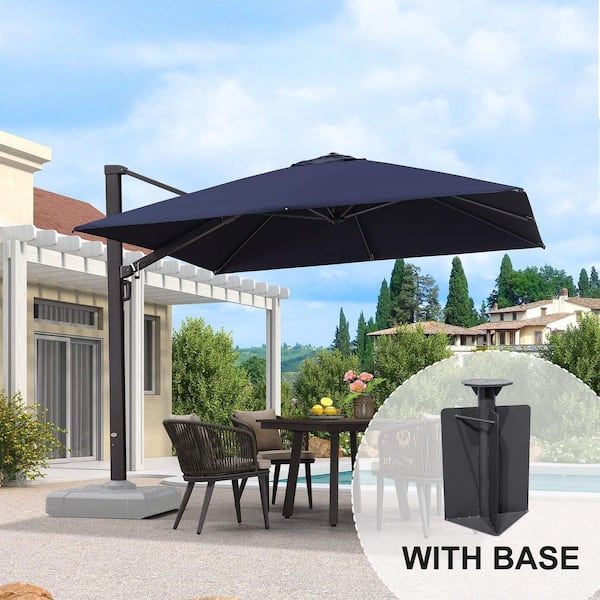 10 ft. Square Aluminum Large Outdoor Cantilever 360-Degree Rotation Patio Umbrella with Base in Ground, Navy Blue